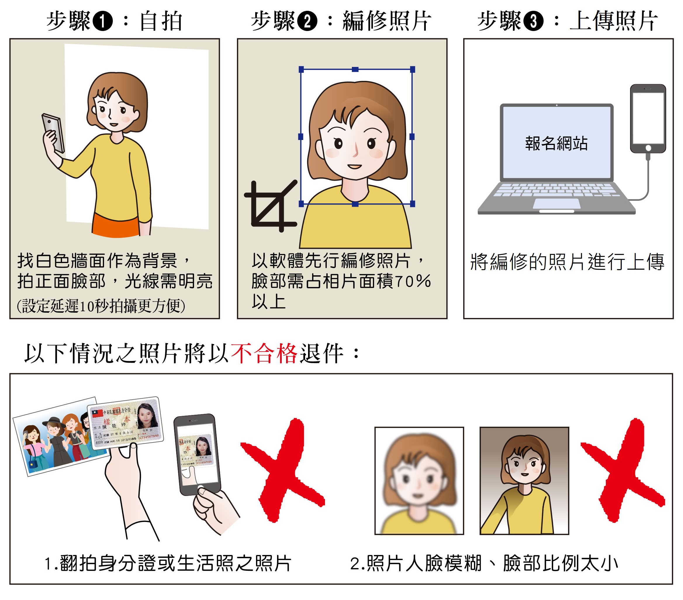 請依據簡章及線上報名程序,確實填寫各項報名資訊及上傳所需之證明文件,並拍照上傳照片 (頭部至肩上) 。